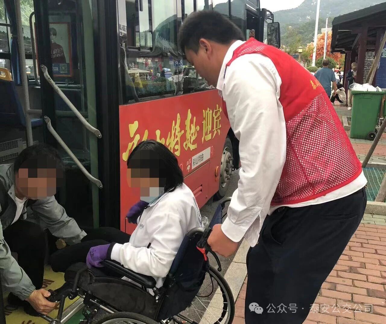 同日,天外村公交樞紐站同樣游客如織。第五分公司公交志愿者趙峰、唐圣春、李磊、劉一鳴正在現場(chǎng)維持乘車(chē)秩序,這時(shí),他們發(fā)現不遠處有位腿腳不便的男士,正牽著(zhù)孩子、推著(zhù)輪椅上的愛(ài)人,朝著(zhù)旅游專(zhuān)線(xiàn)乘車(chē)處趕來(lái)。趙峰立刻主動(dòng)走上前詢(xún)問(wèn)需求,得知這是一家三口來(lái)泰山旅游,下山后需要乘車(chē)前往紅門(mén)。